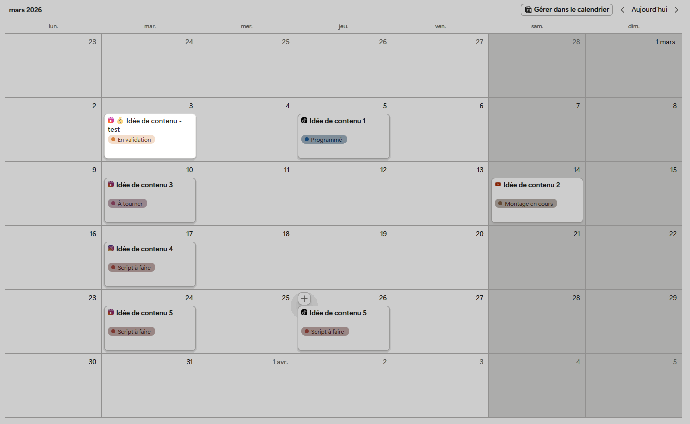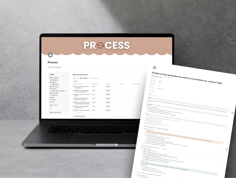 Elle avait déjà un espace Notion, mais il n’était pas optimisé : des listes un peu partout, des pages qui ne communiquaient pas entre elles, des idées de contenus en vrac… et surtout une difficulté à bien séparer la vie perso de la vie pro. Résultat : beaucoup de charge mentale et une impression de courir après ses tâches au lieu de piloter son activité.